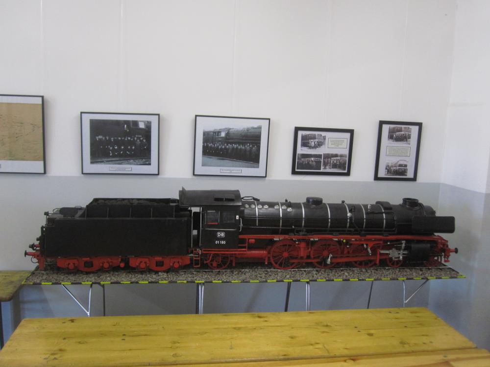 Im hinteren Teil des Durchganges steht ein Modell einer Schnellzugdampflok der Baureihe 01 im Maßstab 1:5, das ein Vereinskollege in Heimarbeit gebaut hat. An der Wand dahinter sind Bilder von Lokomotivpersonalen des ehemaligen Bahnbetriebswerkes Wittenberge angebracht.