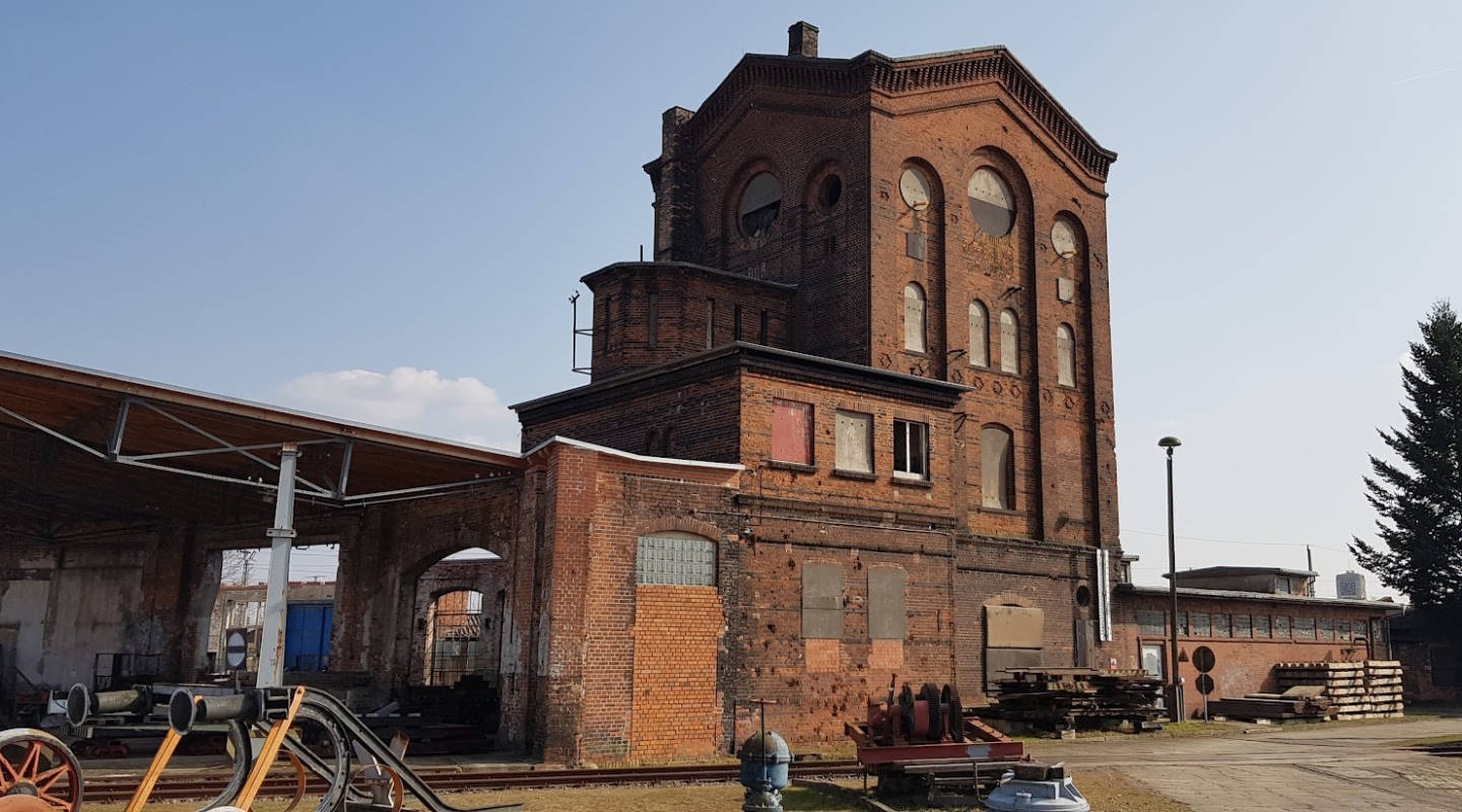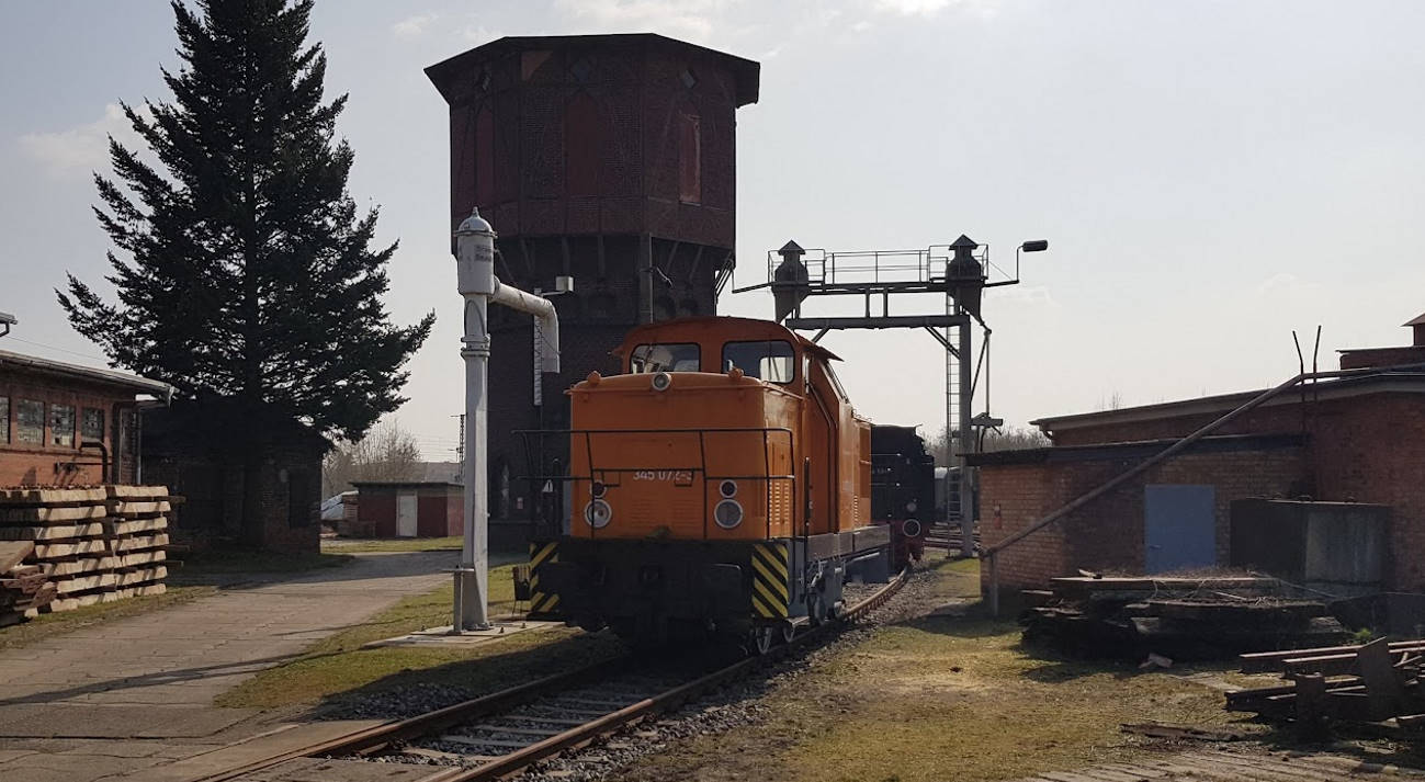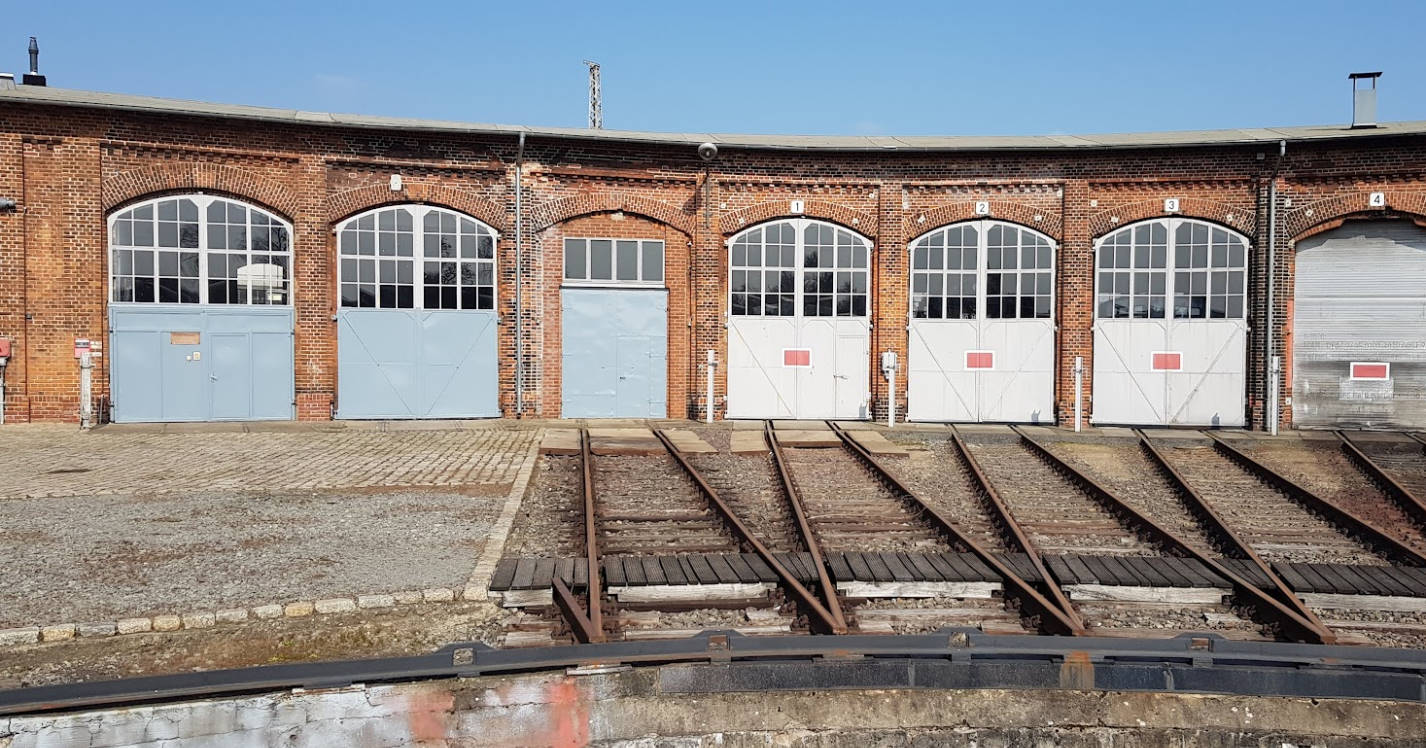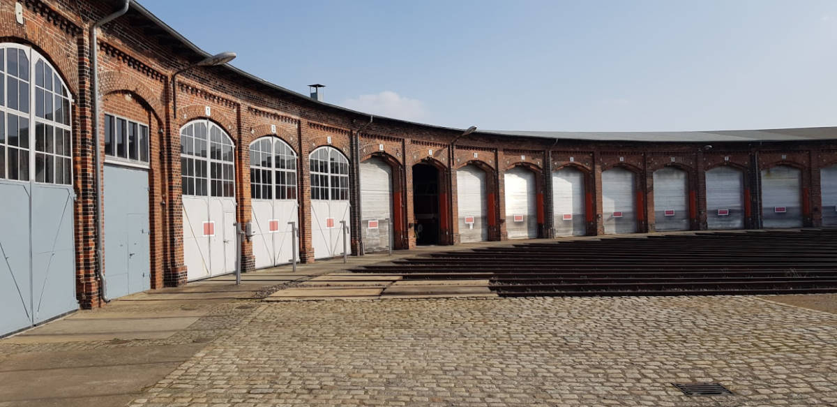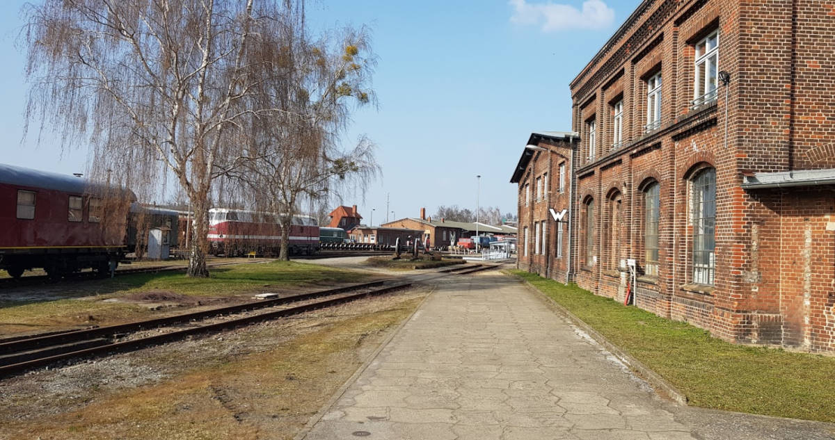 Blick zurück auf den Lokschuppen 2, der heute das Museum beherbergt. Rechts im Bild das ehemalige Wasserhaus, in dem sich ehemals große Wasserbehälter zur Versorgung der Dampflokomotiven befanden