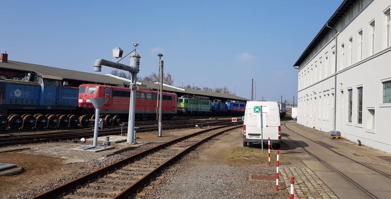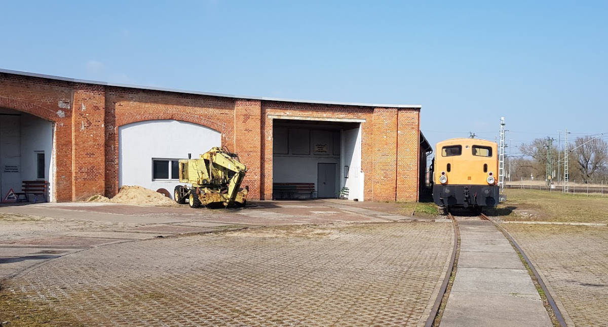 Blick auf die ehemalige Magdeburger Bahnhofsseite. Hier fuhren bis 1999 die Züge in und aus Richtung Süden. Heute finden hier unsere Führerstandsmitfahrten statt. Außerdem ist ein Gleisbaumaschine ausgestellt. Die Brachfläche daneben wird seit kurzem durch eine Straße und ein kleines Einkaufszentrum belebt.