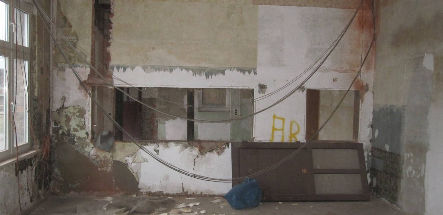 Blick in das Innere der ehemaligen Lokdienstleitung. Vor der Zwischenwand saßen die Lokleiter, die die täglichen Aufgaben an die Lokpersonale durch das noch erkennbare Fenster in der Wand verteilten. Die Zwischenwand wurde entfernt und es entstand der Empfangsbereich des Museums.