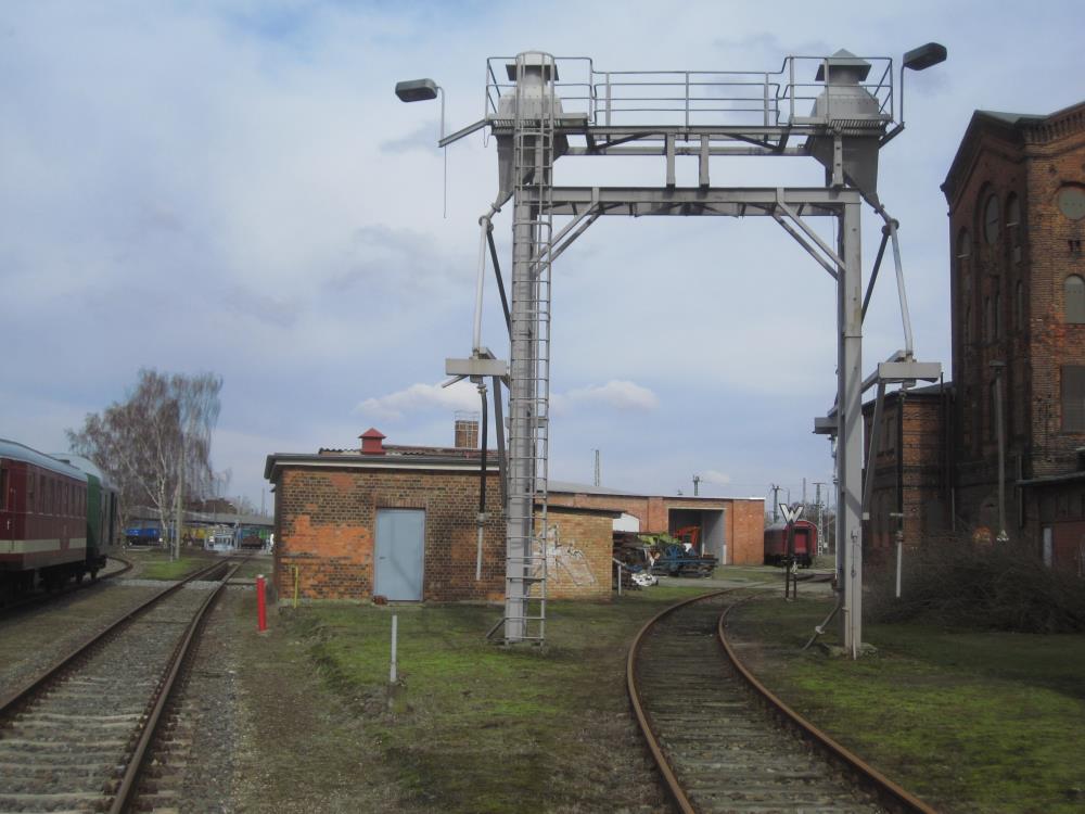 Das auf dem Bild erkennbare Gerüst diente zuletzt als Besandungsanlage für Lokomotiven. Diese führen immer einen Sandvorrat mit, der im Bedarfsfall vor die Räder gestreut werden kann, um die Reibung zwischen Rad und Schiene zu erhöhen. Das kann bei rutschigen Verhältnissen notwendig sein, um das Durchdrehen von Antriebsrädern oder deren Blockieren beim Bremsen zu vermindern. In dem kleinen Gebäude links dahinter wurde der angelieferte Sand zunächst getrocknet, damit er beim Einsatz in Lokomotiven nicht verklumpte und deren Streudüsen verklebte.