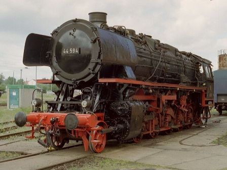 Die Dampflok 44 594 wurde im August 1941 an die Deutsche Reichsbahn ausgeliefert. Sie gehört einer Serie von schweren Güterzugloks an, die mit drei Zylindern ausgerüstet waren und mehr als 2.000 PS auf die Schiene brachten. Viele Loks dieser Baureihe verblieben nach dem 2. Weltkrieg bei der Deutschen Reichsbahn der DDR, viele andere bei der Deutschen Bundesbahn in Westdeutschland. Unser Exemplar wurde hauptsächlich von Dillenburg, Gießen und Betzdorf aus eingesetzt. Für die letzten Monate ihrer aktiven Zeit (1975) wurde sie nach Gelsenkirchen versetzt.