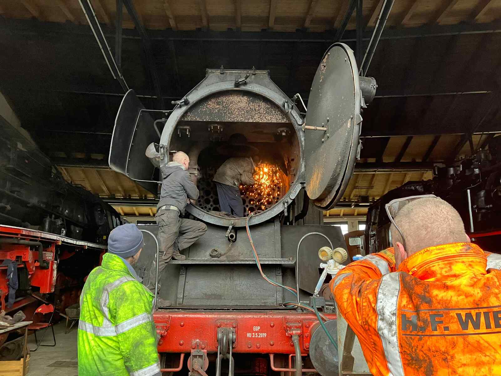 Einige Gäste fragten auch nach dem Lokomotivkessel, der seit Kurzem auf einem Transportwagen im Gelände des Museums gelagert wird. Heute wollen wir das Geheimnis etwas lüften. Es handelt sich um einen Kessel, wie er auch auf unseren Dampfloks der Baureihe 50 zum Einsatz kommt. Die derzeit auf den Lokomotiven montierten Kessel werden in absehbarer Zeit ihre Einsatzgrenze erreichen bzw. ihr Weiterbetrieb erfordert umfangreiche Arbeiten. Für den Fall, dass einer der vorhandenen Kessel zu hohe Investitionen benötigt, konnten wir diesen Ersatzkessel erwerben, dessen Substanz gut ist. Getreu dem Motto "Besser haben als brauchen" wird er nun zunächst konserviert und im Museumsgelände eingelagert, bevor über seine weitere Verwendung entschieden wird.