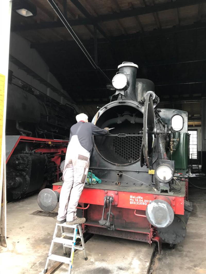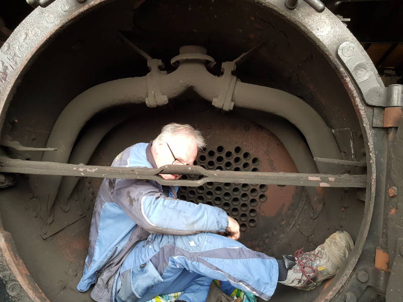 Unsere Dampflok Emma wird auch gerade wieder aus dem Winterschlaf erweckt. Nach Auswaschen des Kessels wurden die Waschluken wieder eingesetzt und die Rohre, die von der Feuerkiste in die Rauchkammer führen, von Asche und Ruß befreit