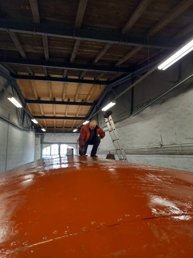 Wie schon vor kurzem berichtet, laufen nun die Arbeiten an dem Beiwagen 190 851 auf Hochtouren. Inzwischen konnten die Stellen, an denen der Rost die Außenhaut angegriffen hat, mit Rostumwandler behandelt werden. Dieser stoppt die weitere Oxydation des Metalls. Nachdem die chemische Reaktion abgeschlossen war, konnten weite Teile der Außenhaut des Wagens grundiert werden. Inzwischen sind die Seitenwände und das Dach gesäubert und mit Rostschutz versehen.