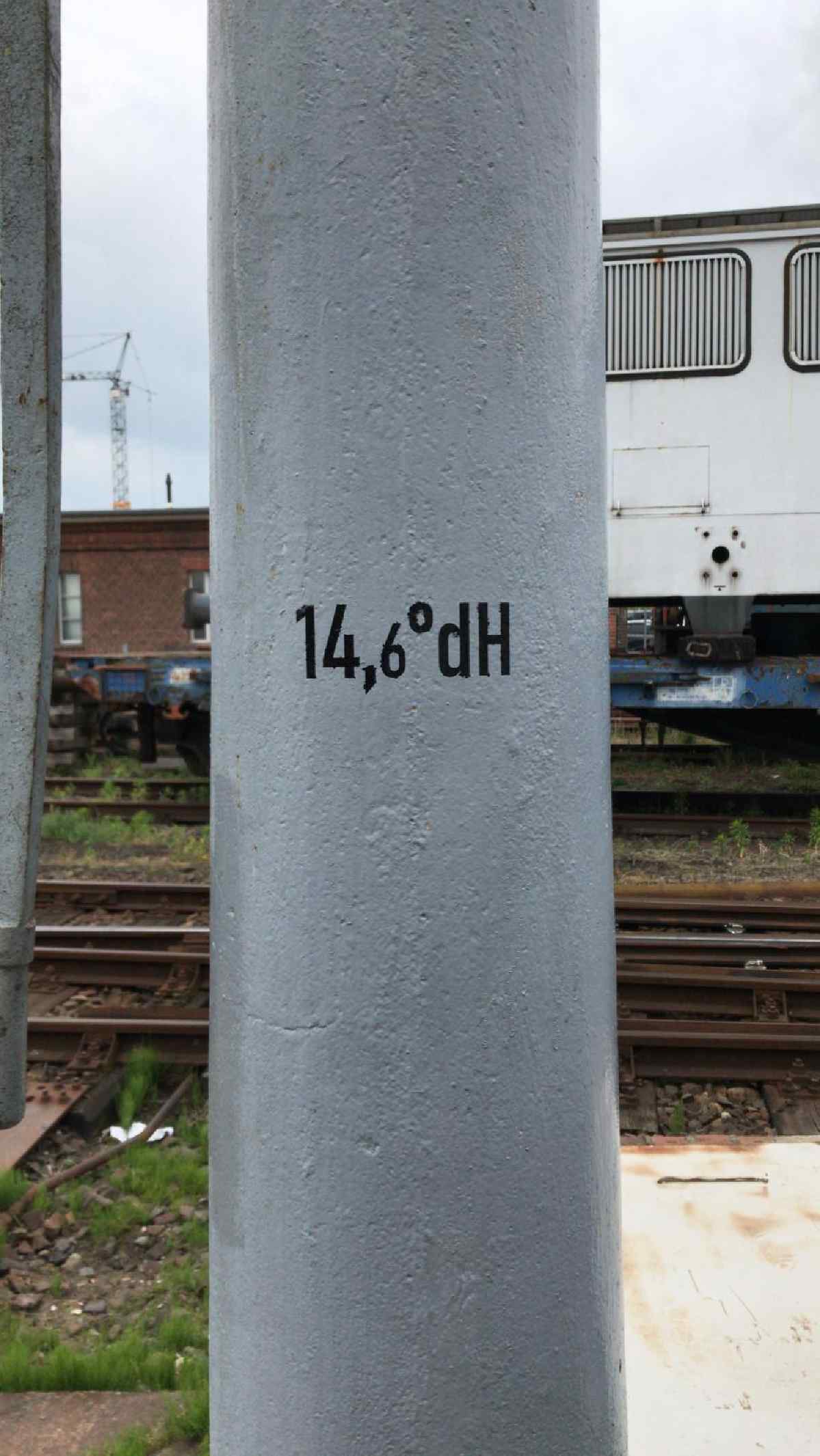 Bei den Ablagerungen handelt es sich hauptsächlich um Kalk, wie Sie sie im Kleinen von Ihrer Kaffeemaschine oder der Waschmaschine kennen. Damit sich der Kalk nicht fest auf den Oberflächen ablagert, benutzen Sie zuhause vielleicht Kalklösemittel in Form von Tabletten. Wir benutzen dafür Soda, das dem Wasser im Tender in Pulverform zugegeben wird und sich dort auflöst. Vor dort aus gelangt es beim Betrieb der Lok in den Kessel und bindet sich dort mit dem Kalk aus dem Wasser zu Schlamm, der sich am Kesselboden absetzt. Da Soda ziemlich schäumt und das beim Betrieb der Lok unerwünscht ist, wird dem Wasser außerdem noch eine sogenannte Schaumbremse zugesetzt. Wieviel Soda zugegeben muss, erkennen die Lokpersonale beim Blick auf die Wasserkräne. Dort sollte angeschrieben stehen, wie hart, also wie kalkhaltig das Wasser ist. Entsprechende Tabellen geben Auskunft darüber, wieviel Soda bei welcher Wasserhärte zugesetzt werden muss.