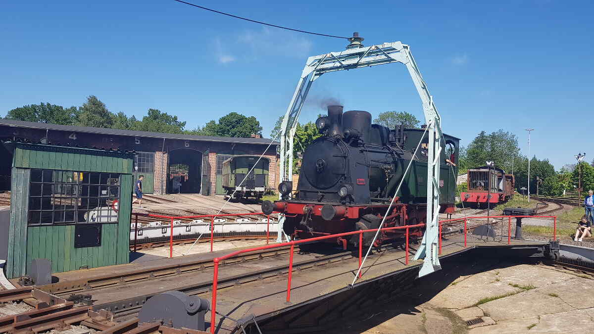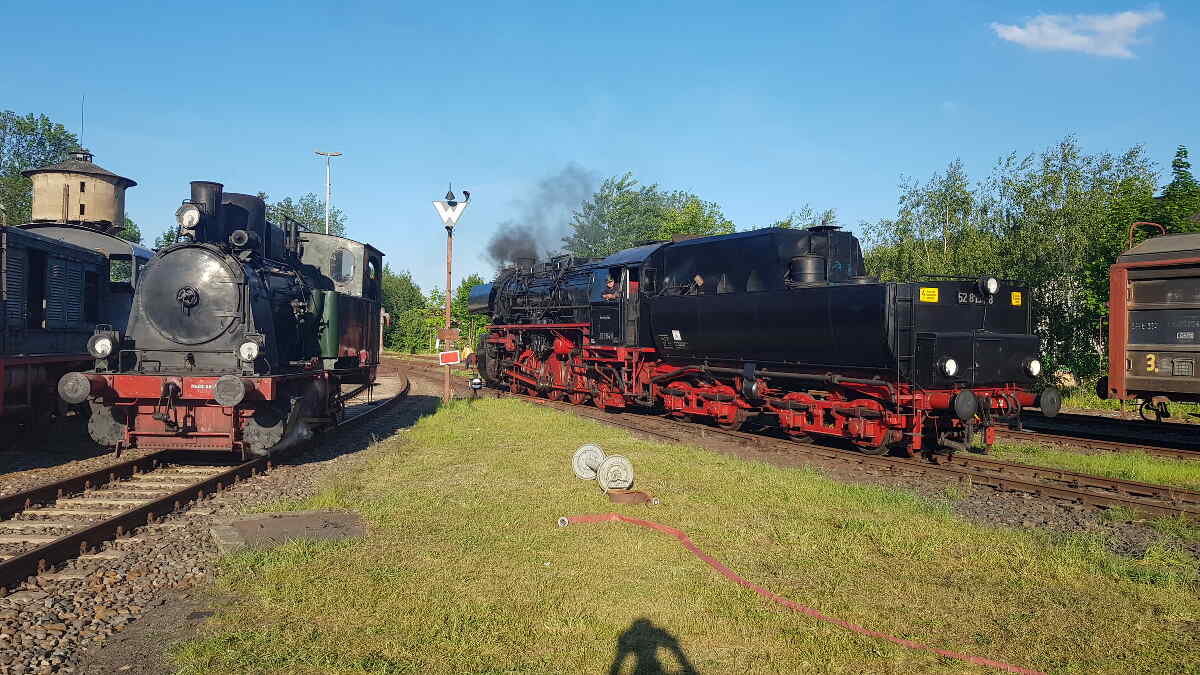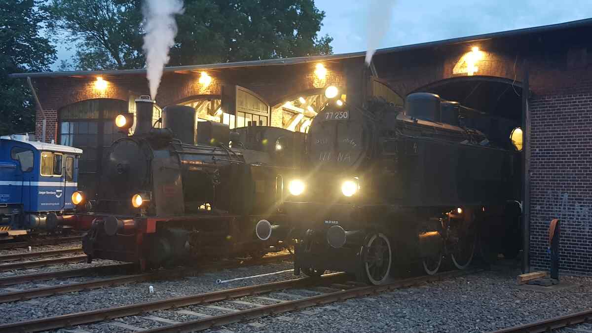 Abends durfte unsere Kleine standesgemäß im bzw. vor dem Lokschuppen Luckau übernachten. Dabei war sie zeitweise in Begleitung der österreichischen Dampflok 77.250, die heute vom Verein Eurovapor mit Standort in Würzburg betrieben wird.