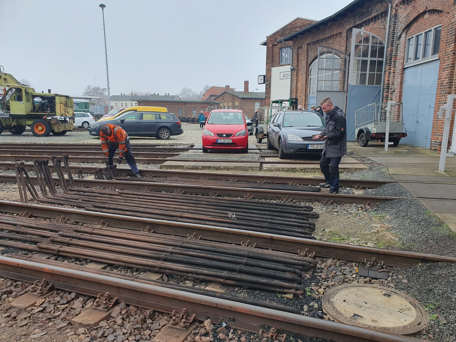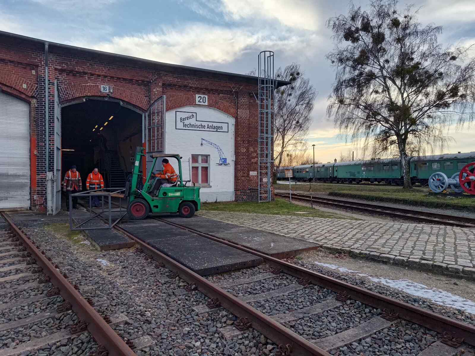 Andere Kollegen waren damit beschäftigt, die schweren Vitrinen in den neuen Ausstellungsraum im Südgiebel unseres Lokschuppens zu bringen. Da er sich in der ersten Etage befindet, mussten alle Rahmen und Glasscheiben der Vitrinen per Gabelstapler hinaufgehoben werden. Danach wurden die Rahmen dort zusammengesetzt. Die Glasscheiben werden demnächst eingebaut.