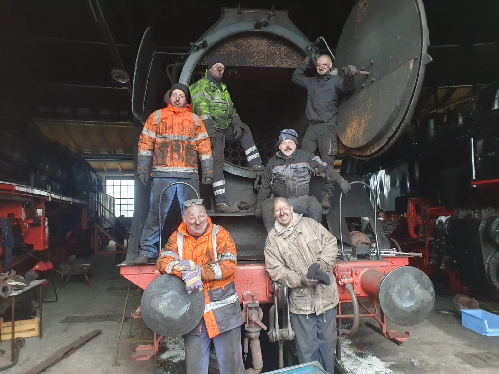 Leider sind die Befestigungsschrauben der einzelnen Elemente im Betrieb der Lok ständig den Abgasen vom Feuer der Lok ausgesetzt. Das führt dazu, dass sich die Schrauben häufig nur schwer lösen lassen und die Muttern zunächst mit einem Schweißbrenner rotglühend erwärmt werden müssen. So dehnen sie ich ein wenig aus und lassen sich dann mit sehr großer Kraftanstrengung abschrauben.