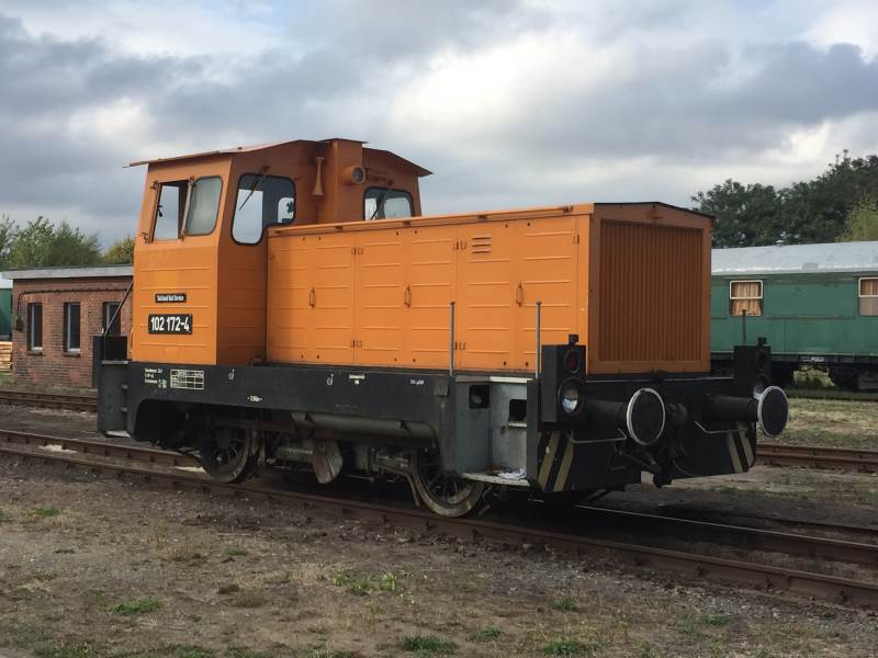 Am 5. September 2018 traf per Tieflader die Diesellok 102 172 als neues Exponat im "Historischen Lokschuppen Wittenberge" ein. Die Maschine gehört zur Baureihe 1021 der Deutschen Reichsbahn (DR), die mehr als 25 Jahre im Bw Wittenberge im Einsatz war. Ende der 1960er-Jahre benötigte die DR moderne Dieselloks für den leichten Rangier- und Streckendienst. Aufbauend auf den Erfahrungen mit den Maschinen der Baureihen V 1510/V 1520 und V 23 plante die Reichsbahn jedoch eine Neuentwicklung. In Zusammenarbeit mit dem VEB Lokomotivbau "Karl Marx" Babelsberg (LKM) entstand eine neue 220 PS starke Diesellok, die zunächst die Typen-Bezeichnung V 231 erhielt. Während der Motor und das Getriebe der Baureihe V 23 der DR nahezu unverändert übernommen wurden, waren der Fahrzeugteil, der Führerstand und die Aufbauten völlige Neukonstruktionen. Im Interesse besserer Laufeigenschaften wurde der Achsstand für die V 231 auf 3.560 mm verlängert. Außerdem wurden die Achsgabelstege, das Blindwellenlager und die Radsätze verstärkt. Im Sommer 1970 begann die Serienfertigung des Typs V 231, deren erste Exemplare die DR im Juli 1970 in Dienst stellte. Bis zum Januar 1971 lieferte der LKM Babelsberg insgesamt 157 Maschinen. Die orangefarbene Lackierung und die kantige Form brachten den Dieselloks der Baureihe 1021 den Spitznamen "Gartenlaube" ein. In einigen Bahnbetriebswerken wurden die Maschinen auch als "Postkasten" bezeichnet. Das Bw Wittenberge erhielt im Herbst 1970 insgesamt sechs fabrikneue Maschinen der Baureihe 1021. Die kleinen Dieselloks wurden hier nicht nur im leichten Rangier- und Bauzugdienst eingesetzt, sondern bespannten auch Personen- und Güterzüge auf der als "Kreisringbahn" bekannten Strecke Perleberg–Karstädt–Berge–Perleberg. Erst am 28. Februar 1997 wurden die letzten drei "Gartenlauben" aus Wittenberge abgezogen. Zu diesem Zeitpunkt hatten die Maschinen, die seit dem 1. Januar 1992 als Baureihe 3121 bezeichnet wurden, erheblich an Bedeutung verloren. Bereits 1994 hatte die Deutsche Bahn AG (DB AG) mit der Ausmusterung der kleinen Dieselloks begonnen. Die letzten Exemplare hatten schließlich im November 2001 ausgedient. Die Diesellok 102 172 wurde 1970 mit der Fabrik-Nummer 265.072 in Babelsberg gebaut. Nach der Endabnahme am 31. Oktober 1970 wurde die Maschine dem Bw Reichenbach (Vogtland) zugewiesen. Dort wurde die Baureihe 1021 u.a. von den Einsatzstellen Adorf, Falkenstein und Werdau für den Rangierdienst benötigt. 102 172 war äußerst standorttreu. Abgesehen von einem kurzen Gastspiel in Zwickau in den Jahren 1994/95 war die Maschine ausschließlich in Reichenbach (Vogtland) stationiert. Am 2. Juli 1997 verfügte die DB AG die seit 1992 als 312 172 bezeichnete Diesellok in den Schadpark und musterte sie schließlich am 30. Oktober 1997 aus. Bereits am 1. November 1997 erwarb ein Mitglied des Vereins "Lugauer Eisenbahnfreunde e.V." die Maschine, die später als Leihgabe an den Verein "Eisenbahnfreunde Traditionsbahnbetriebswerk Staßfurt e.V." abgegeben wurde. Auch nach dem Ende des Leihvertrages im Jahr 2014 verblieb die Maschine in Staßfurt. Ende 2017 erwarb schließlich die Salzland Rail Service GmbH die Diesellok und ließ sie nun nach Wittenberge bringen. 102 172 ist derzeit nur fahrfähig, eine betriebsfähige Instandsetzung ist jedoch geplant.