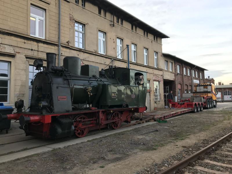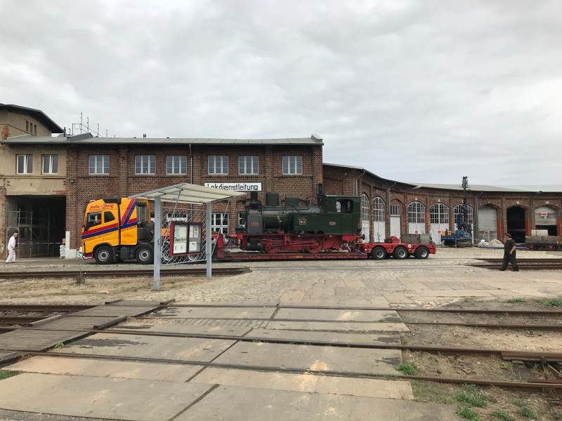 Unsere Dampflok "EMMA" ist wieder in Wittenberge. Am Dienstag (25.09.2018) wurde die Maschine auf dem Messegelände in Berlin auf einen Tieflader der Spedition Arne Ehrig KG verladen und auf der Straße nach Wittenberge transportiert. Am Morgen des 26. September 2018 erfolgte die Entladung der Dampflok. Nach nicht einmal zwei Stunden war die Aktion beendet und "EMMA" stand wieder auf ihrem Standplatz. An den nächsten beiden Wochenenden wird die Maschine dann für ihren letzten Einsatz in diesem Jahr – unsere Herbstdampftage am 13. und 14. Oktober 2018 – vorbereitet.